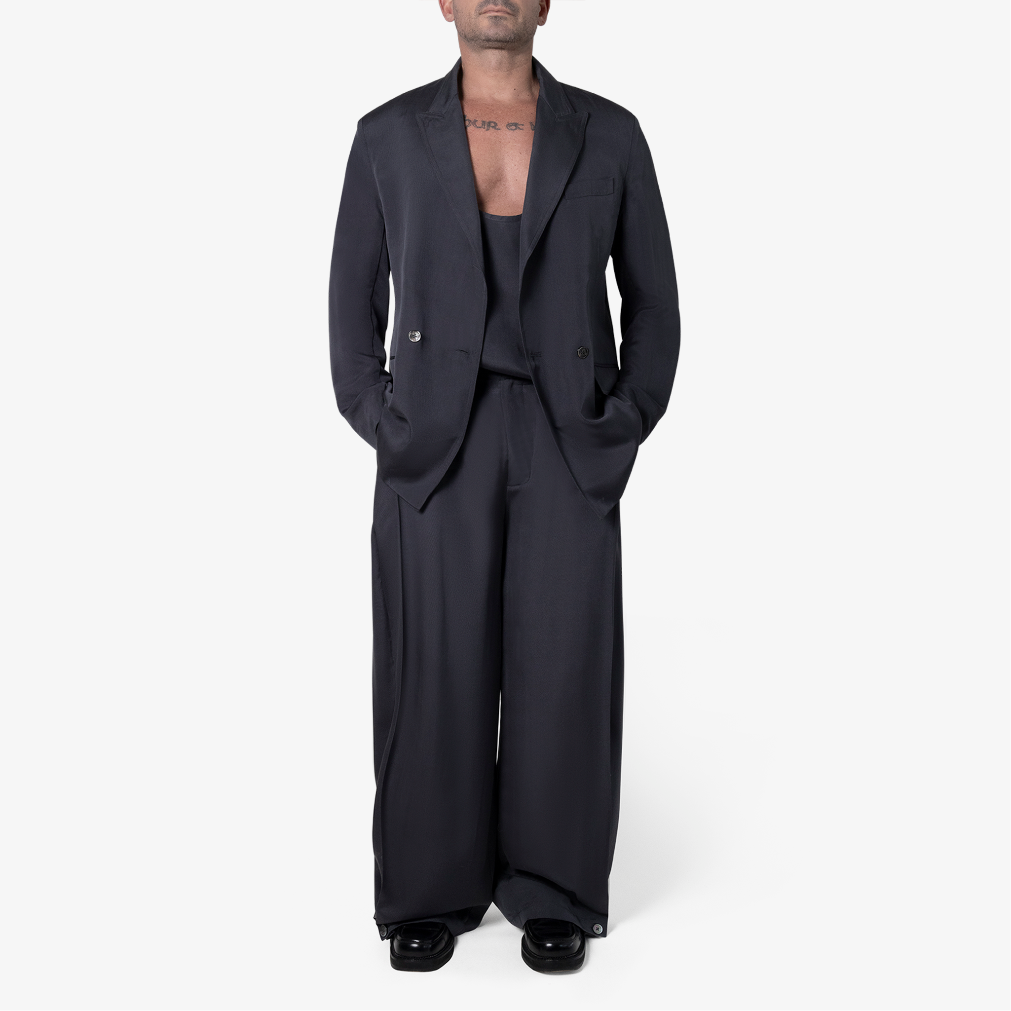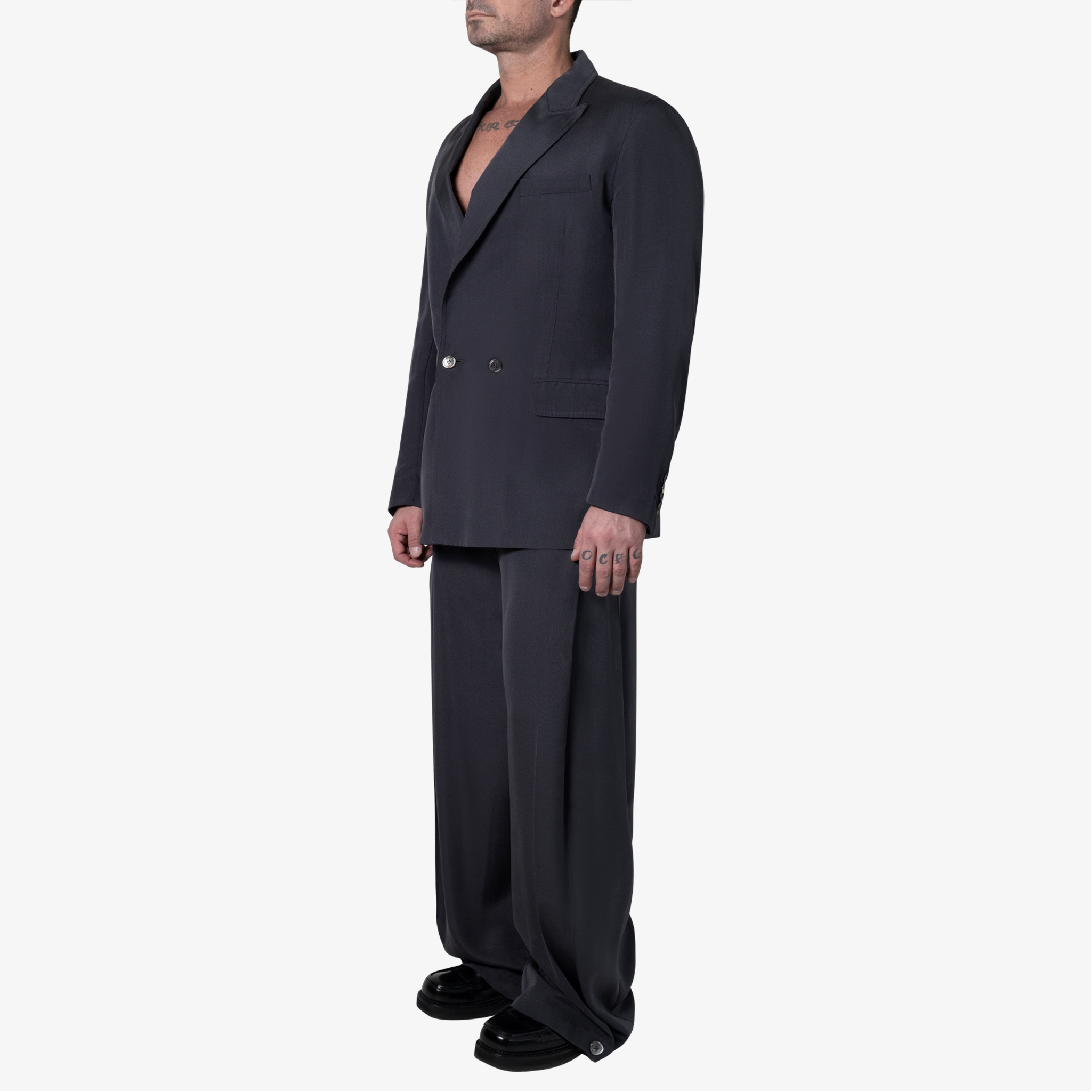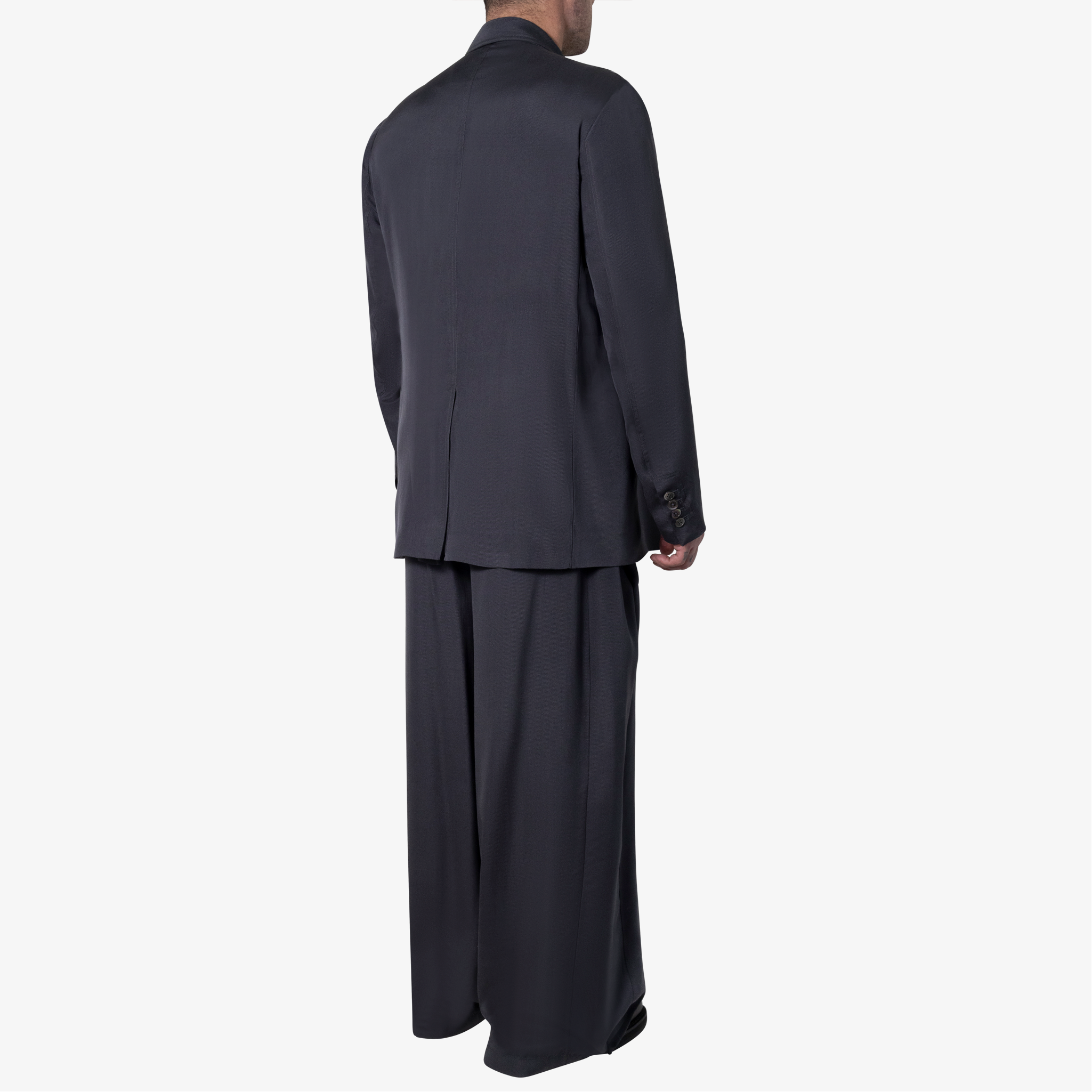 Double-breasted jacket in silk twill. Peak lapels, chest pocket, two side flap pockets and back vent. Fully functional sleeve plackets. Top stitch detail at undercollar and lapel. Hand finished.