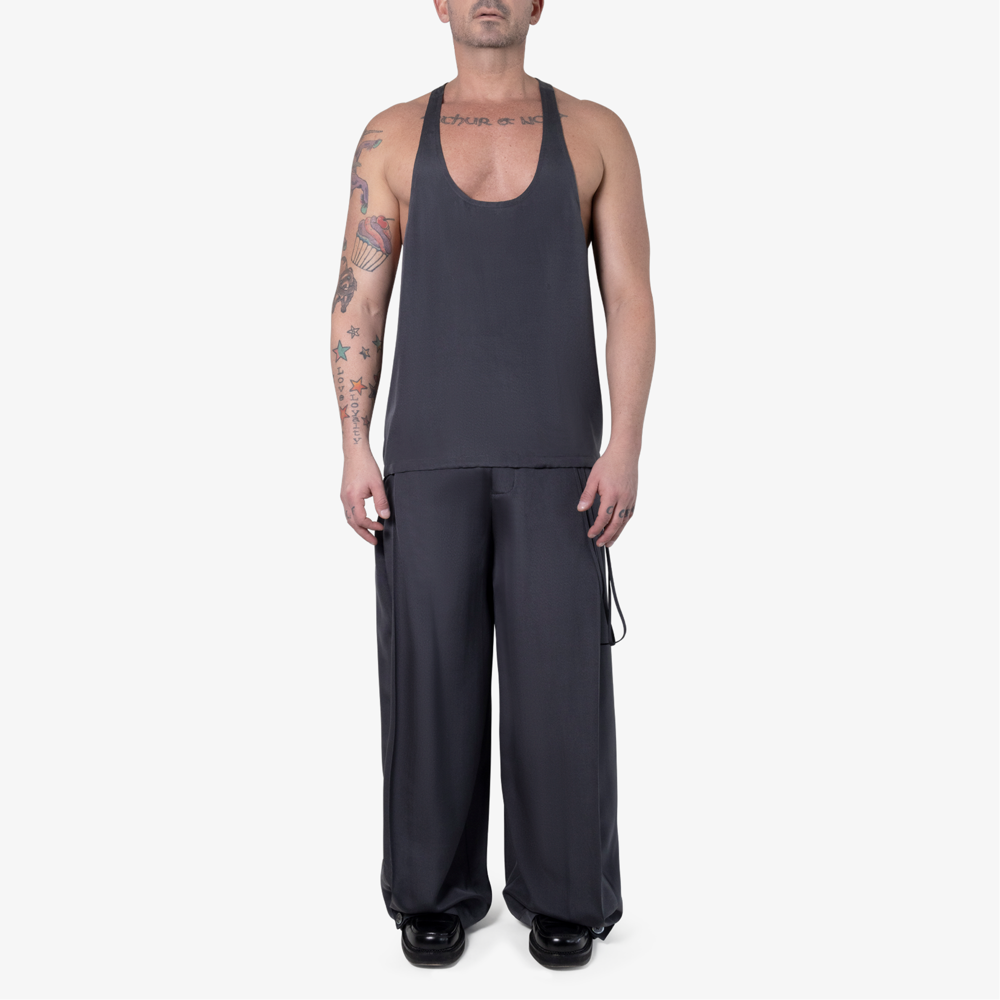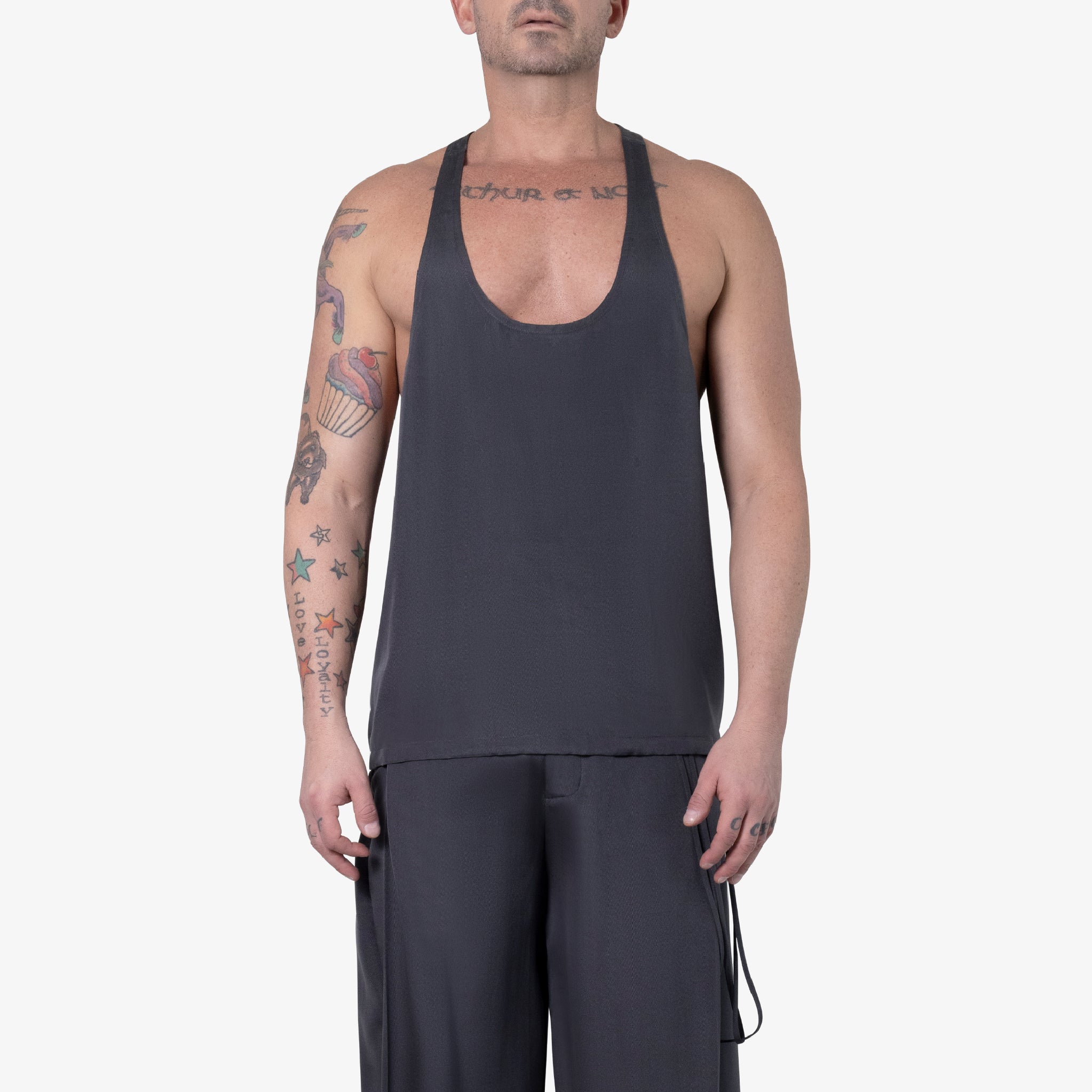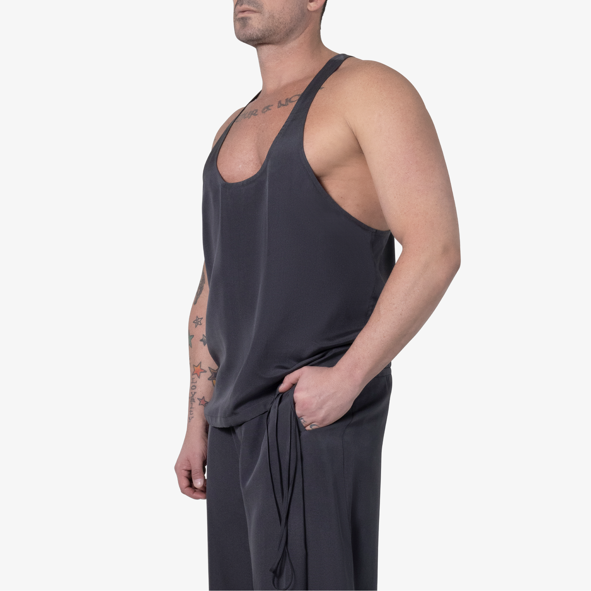 Drop Neck, relaxed fit tank top in silk twill with blouson and drawcord detail at hem.