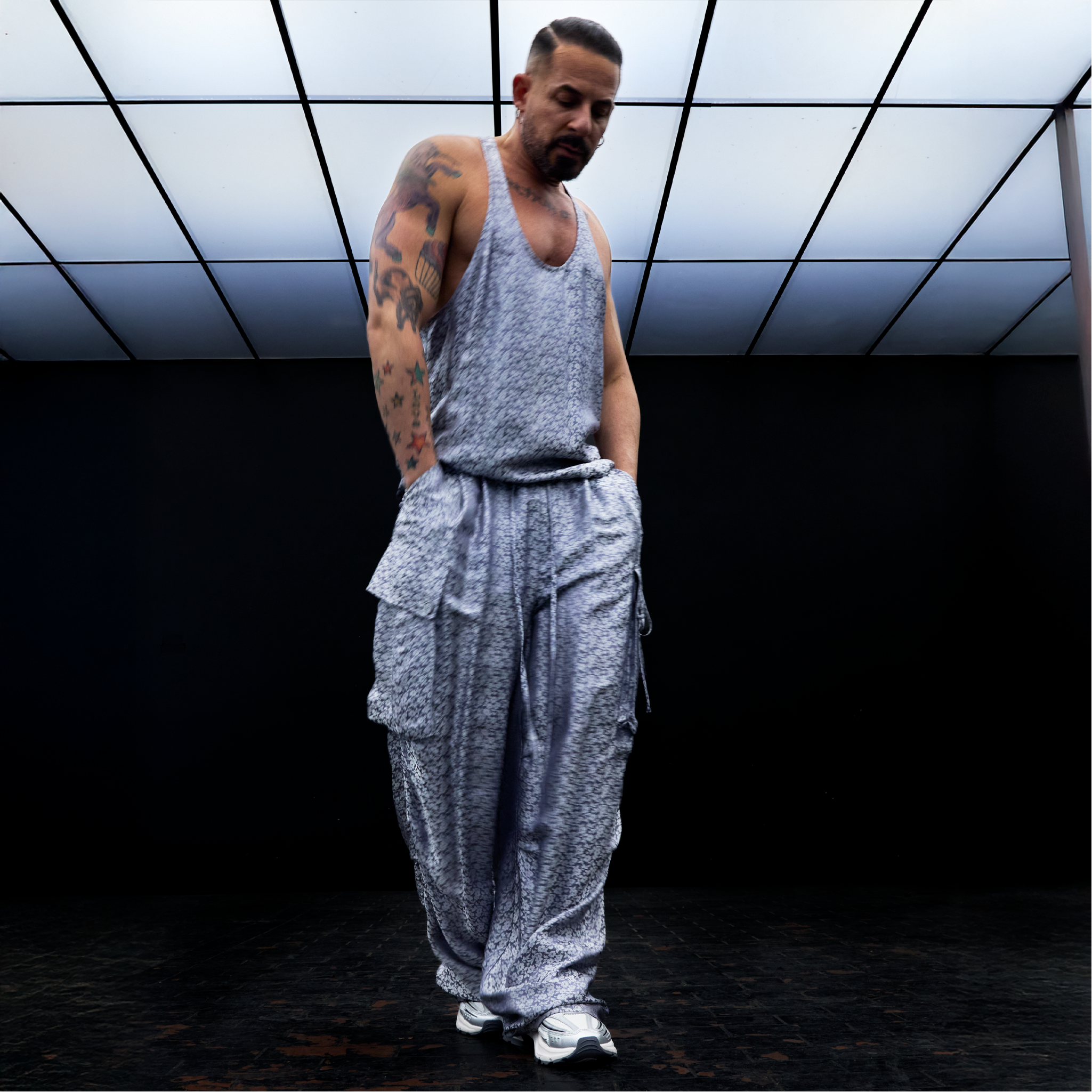 Relaxed fit utility cargo pant in floral silk jacquard. Elastic waist with drawcord and gathering details. Articulated knees with functioning bellow patch pocket details.