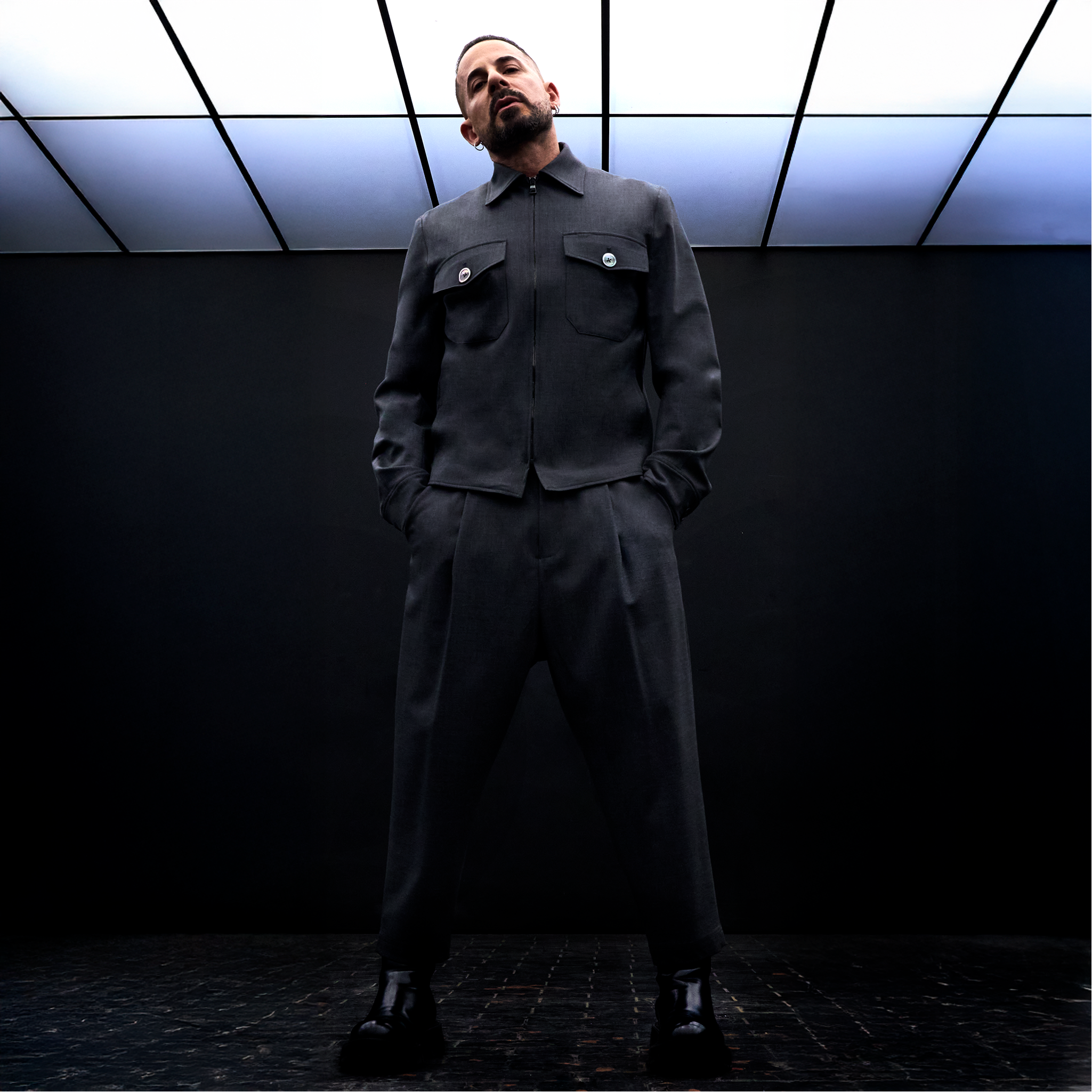 Zip front wool jacket with exaggerated spread collar and pleated action back panel. Fully functional patch pockets at chest and front facing on seam pockets.